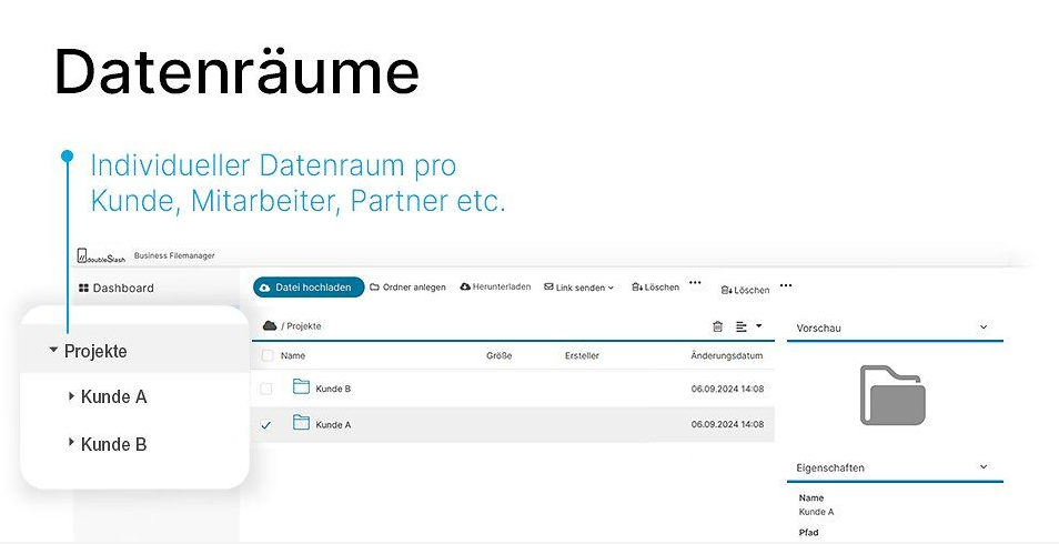 Mit dem Business Filemanager können Daten über eine eigene online Plattform hoch- bzw. heruntergeladen, beobachtet oder synchronisiert werden (File Sync) und zugleich geräteunabhängig mit Kolleginnen und Kollegen, Partnerunternehmen und Kundinnen und Kunden versendet werden (File Share):