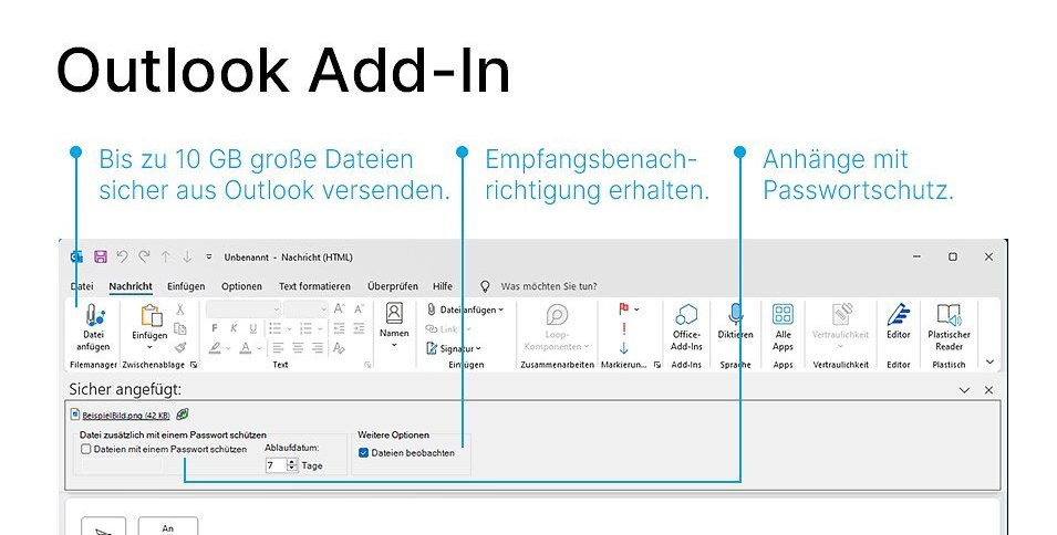 Dateien können ganz einfach aus der Applikation selbst, per E-Mail-Anhang oder auch ohne Business Filemanager Account versendet werden. Je nach Client können bis zu 10 GB große Dateien versendet werden.