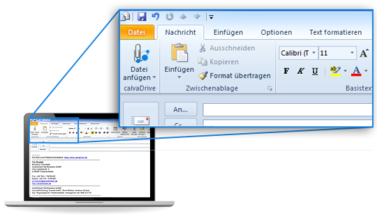 Das Outlook-Add-In passt perfekt zu den Anforderungen der IT: Große E-Mail-Anhänge werden vermieden und E-Mail-Server entlastet. Zudem hält calvaDrive gängige Sicherheitsrichtlinien und Compliance ein. Überzeugen Sie sich gerne mit einer Testversion oder auch in einem persönlichen Gespräch von den Vorteilen dieser Funktion.