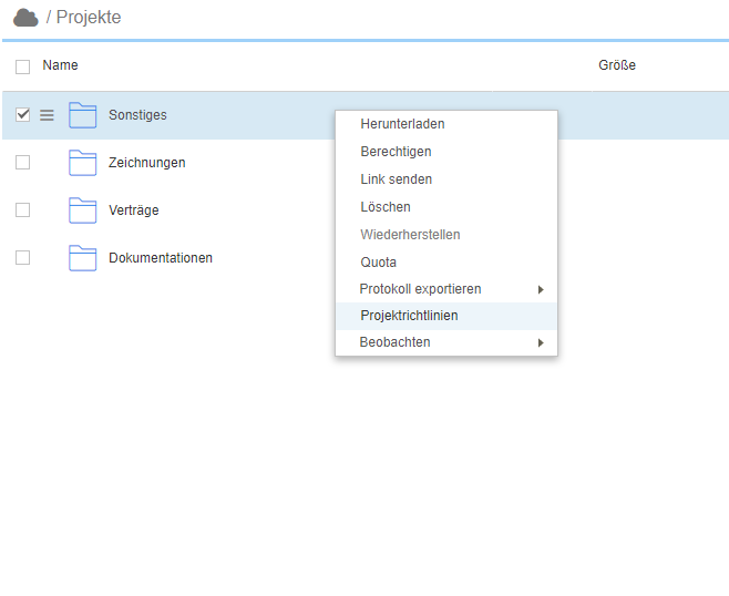 Sie erreichen die Richtlinienverwaltung für den Projektebereich bequem über das Kontextmenü eines Datenraumordners. Für den Bereich „Meine Dateien“ kann diese Richtlinie in den Einstellungen konfiguriert werden.
