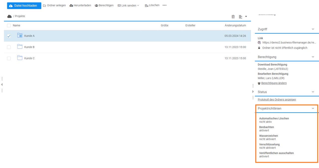 Sie gelangen bequem über das Kontextmenü eines Datenraumordners zur Richtlinienverwaltung des Datenraumes.