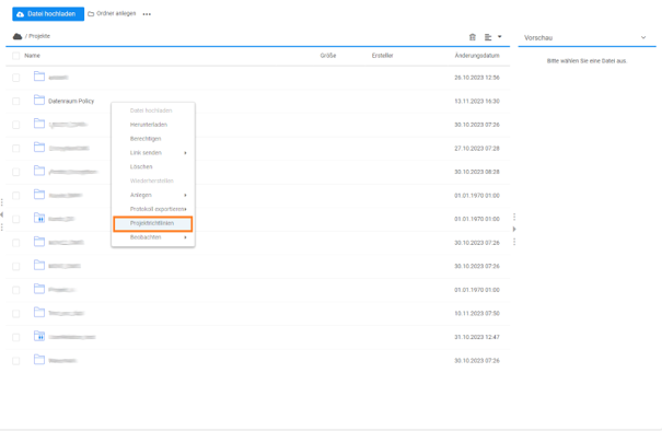 Sie gelangen bequem über das Kontextmenü eines Datenraumordners zur Richtlinienverwaltung des Datenraumes.