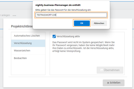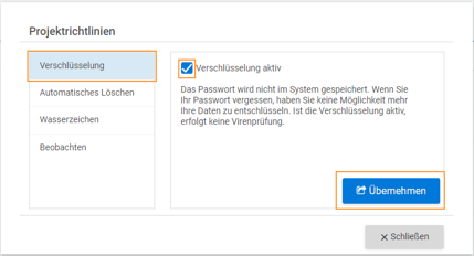 Über den Dialog zur Verwaltung von Datenraum Policies (Richtlinien) kann die Policy "Verschlüsselung" ausgewählt und aktiviert werden.