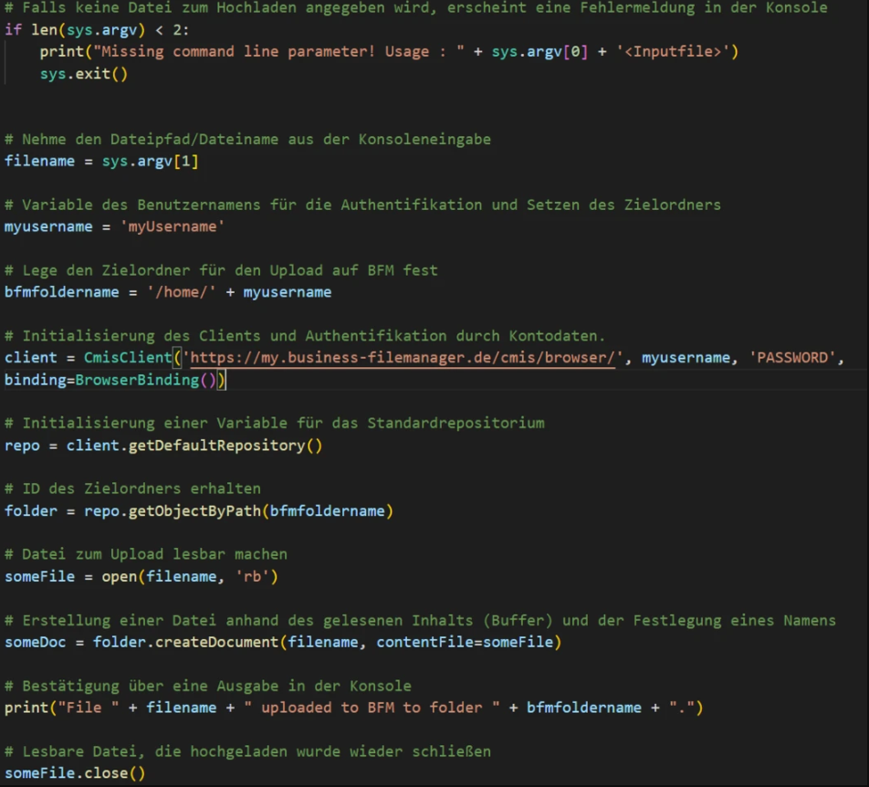 Wie einfach ein Dateiaustausch mit dem Business Filemanager (BFM) möglich ist, sehen wir uns über ein kleines Pythonskript an. Bereits 15 Zeilen Code reichen aus.