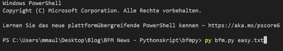 Los geht’s: Wir führen das erstellte Pythonskript namens "bfm.py" mit "py [pythonskript-Name] [Dateiname für den Upload]" aus: