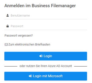 Durch die Verknüpfung von Benutzerkonten im Active Directory und im MS Entra ID können sich Anwender mit den gleichen Login-Daten auf den Business Filemanager anmelden.