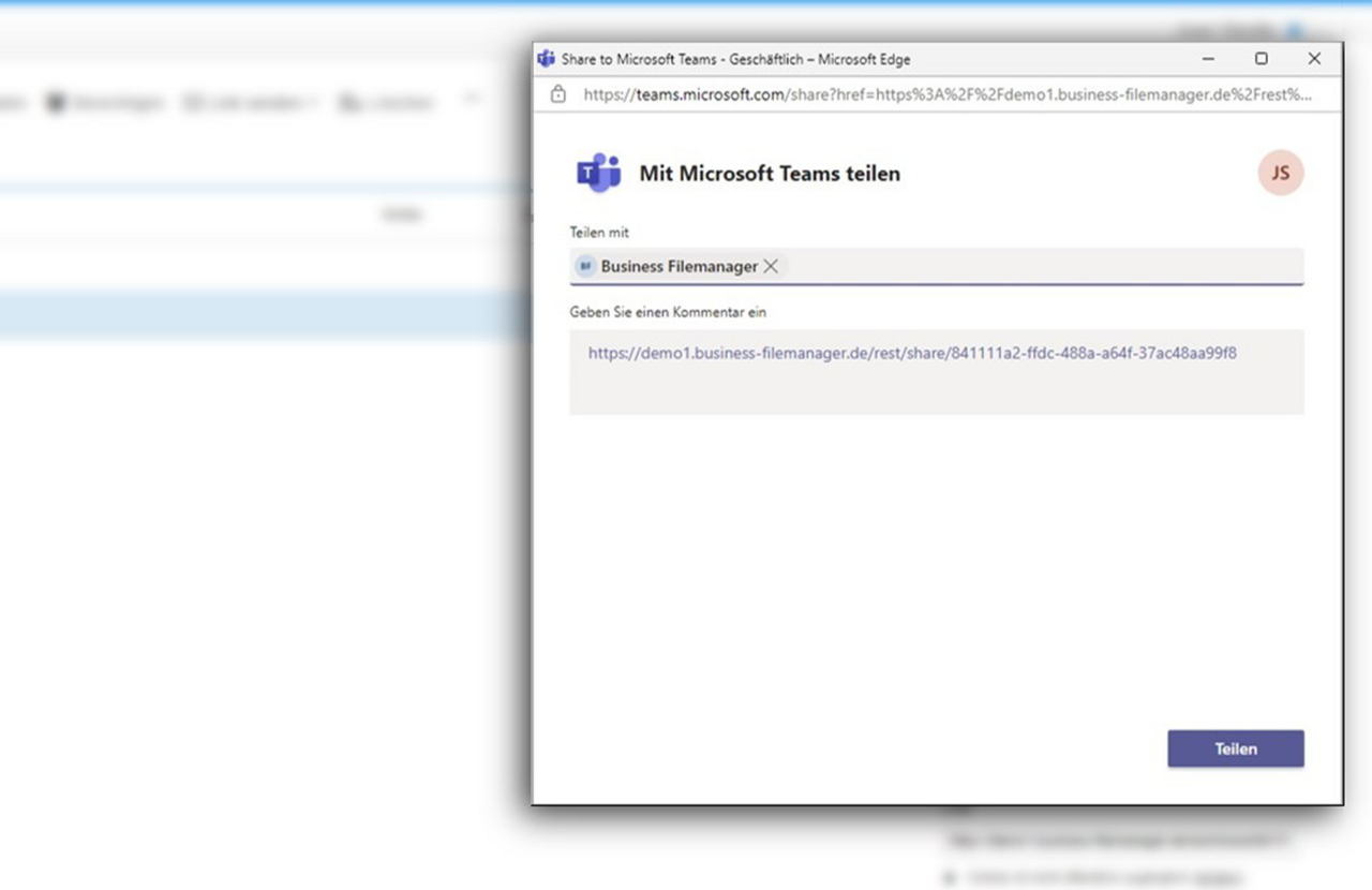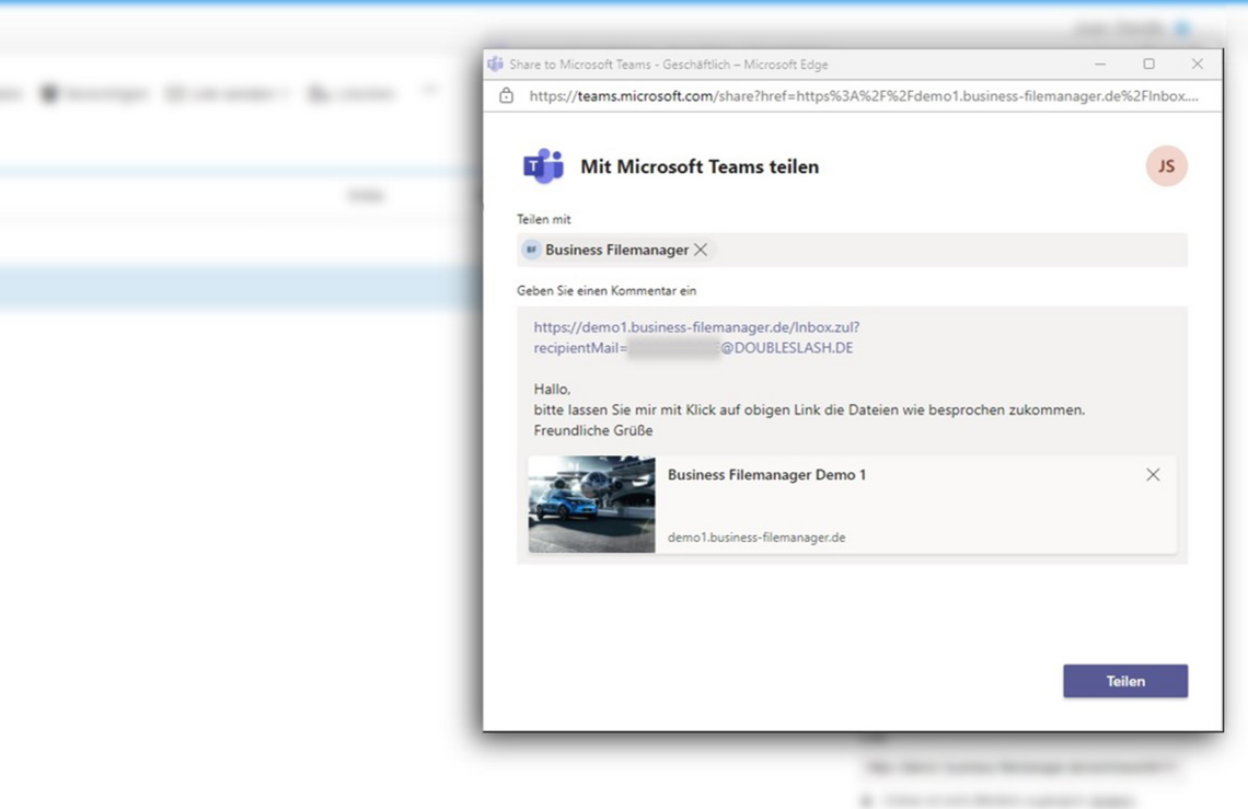 Sie arbeiten mit MS Teams und möchten darüber Ihre Dateien sicher teilen. Um Dateien mit internen und externen Partnern auzutauschen, ohne dabei die Datenhoheit zu verlieren, können Sie Dateien via MS Teams anfordern und in Ihrem Business Filemanager verwalten.